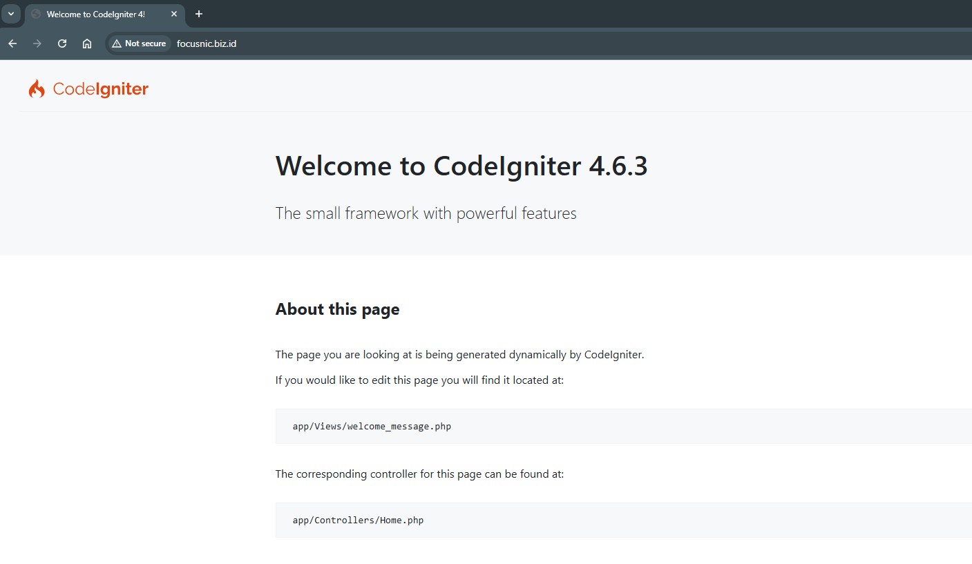 Access the CodeIgniter installation through a browser, for example: http://focusnic.biz.id. If the installation is successful, the following default CodeIgniter page will appear.