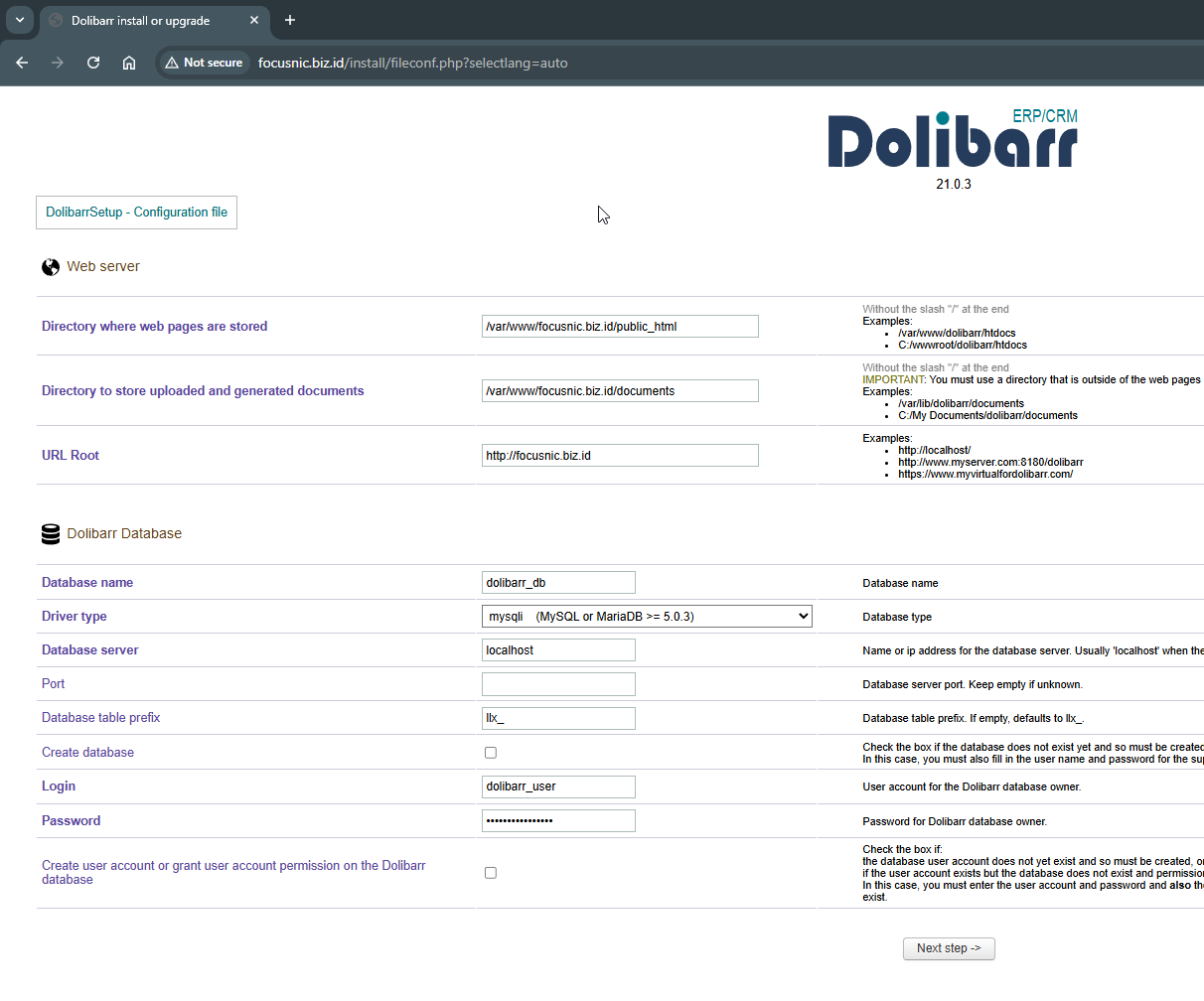 Access the Dolibarr installation in the browser by typing the domain name or IP.