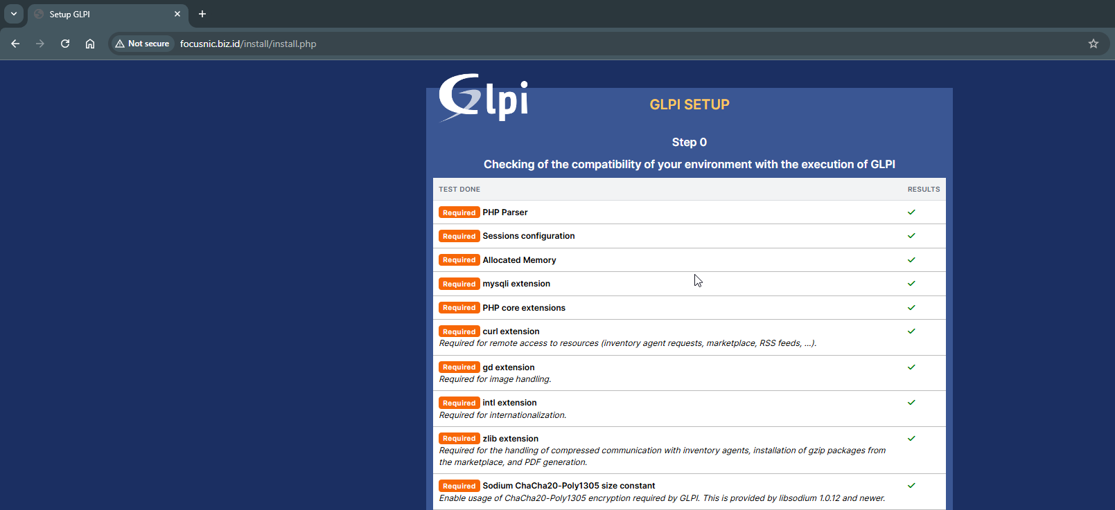 GLPI will perform a compatibility checker before carrying out the installation process, make sure everything is safe.