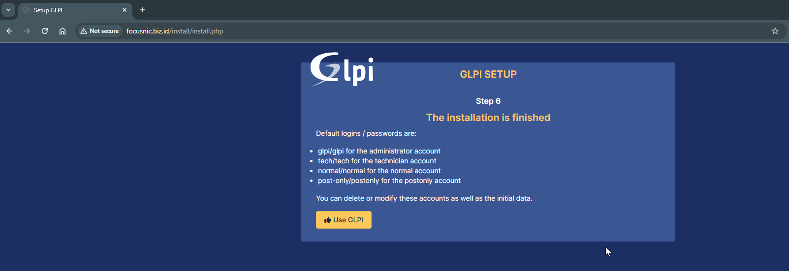 Here is some important access information that can be saved for future GLPI management.