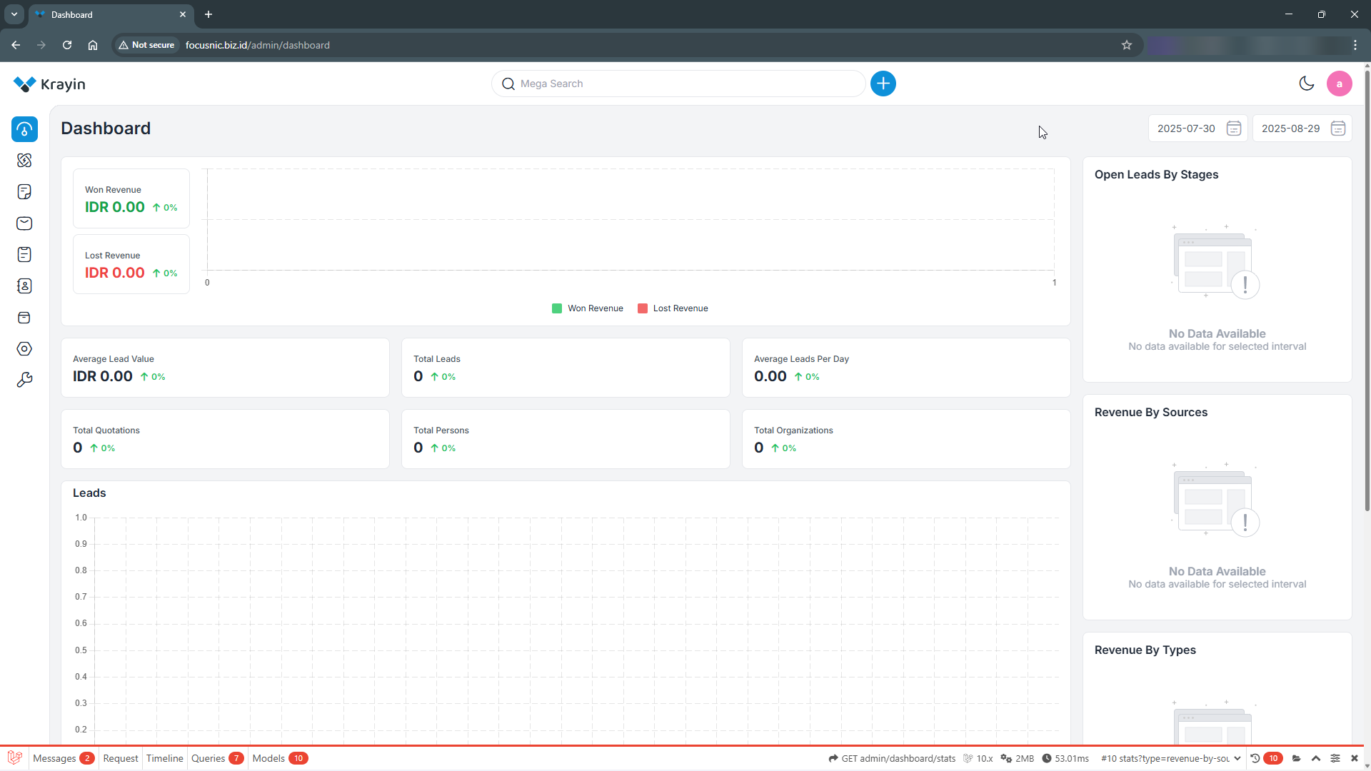 The following is a view of the Krayin CRM dashboard which can be accessed via http://$DOMAIN/admin/login
