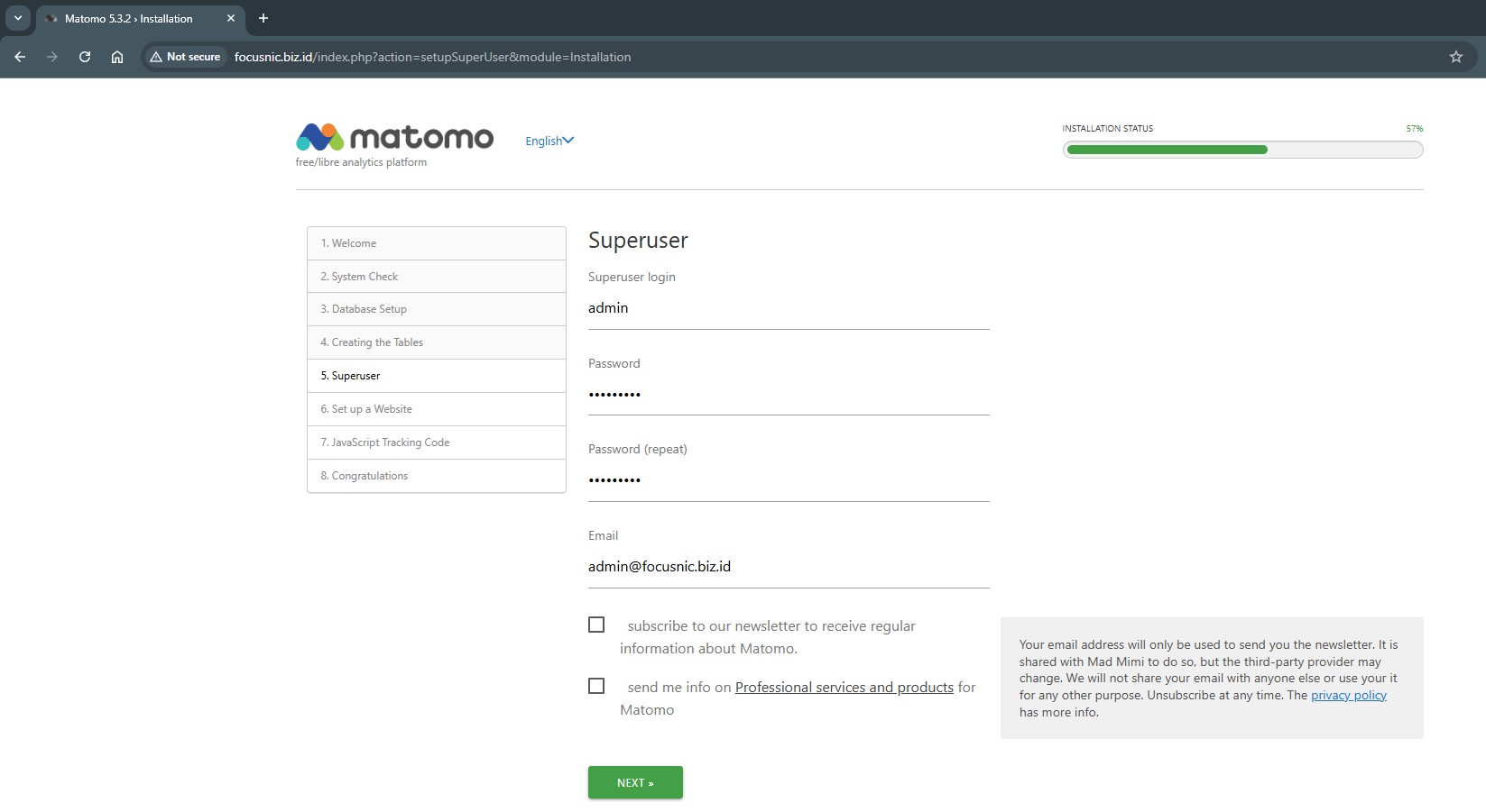 Set up the Matomo database, making sure to use the database, user, and password you created earlier. Continue until the database table creation process is successful.