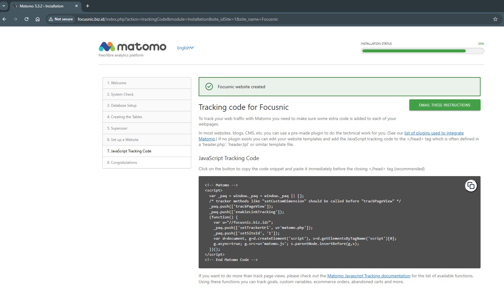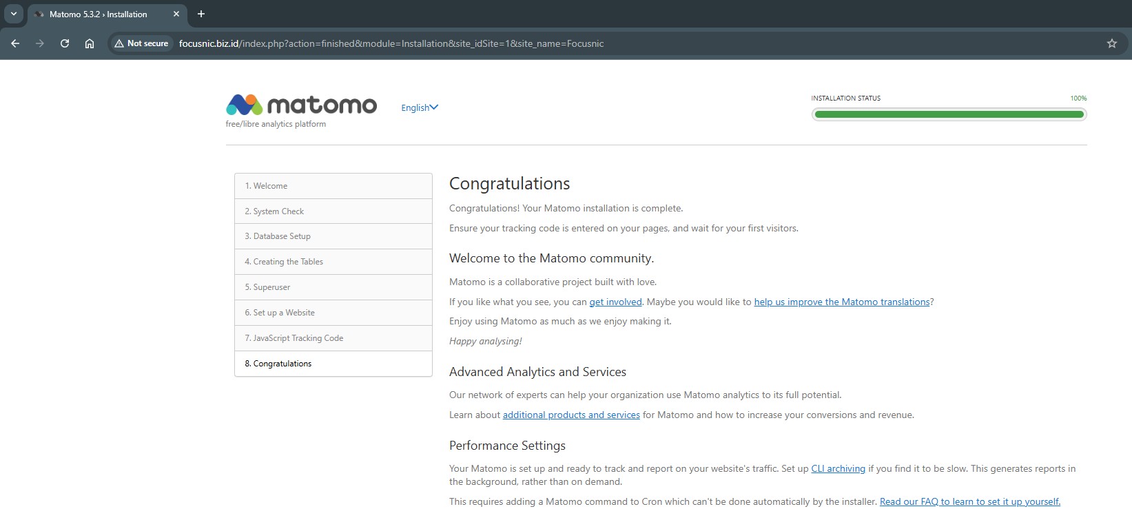 By following this guide, we have successfully installed Matomo Web Analytics on AlmaLinux 8 using the LAMP Stack. This solution provides full control over analytics data without relying on third parties, while maintaining user privacy.
