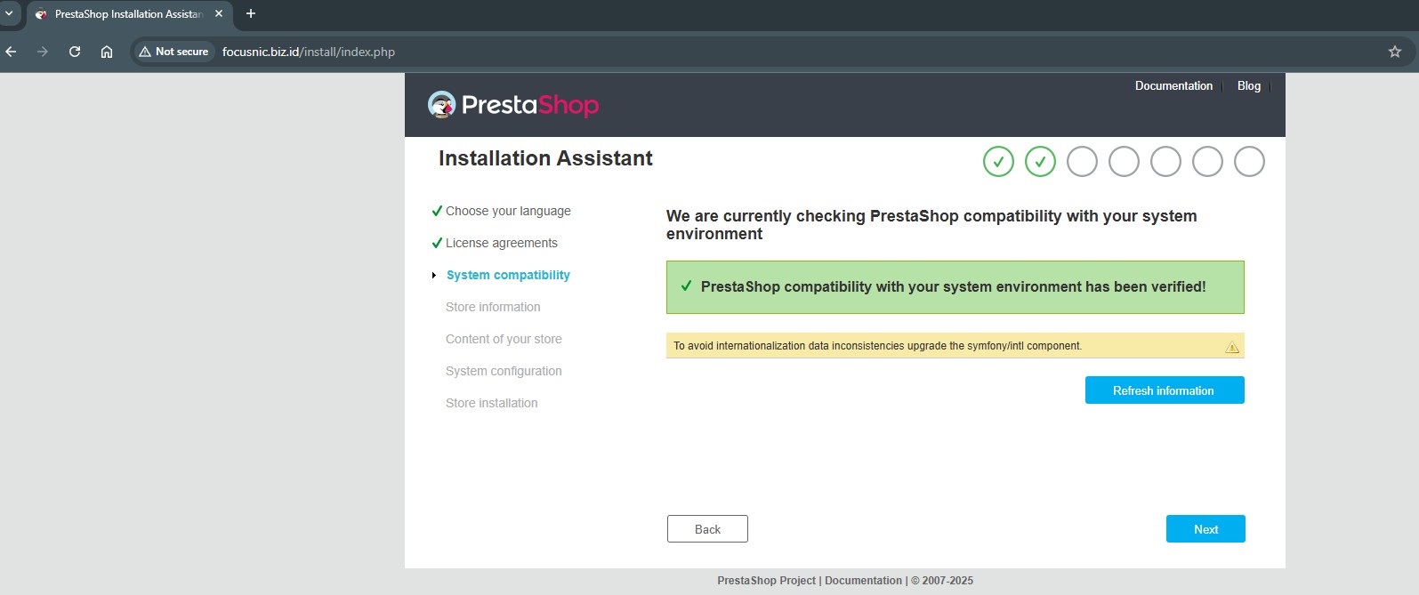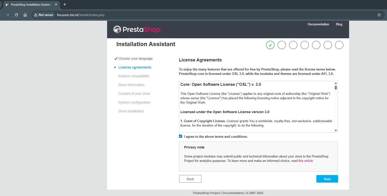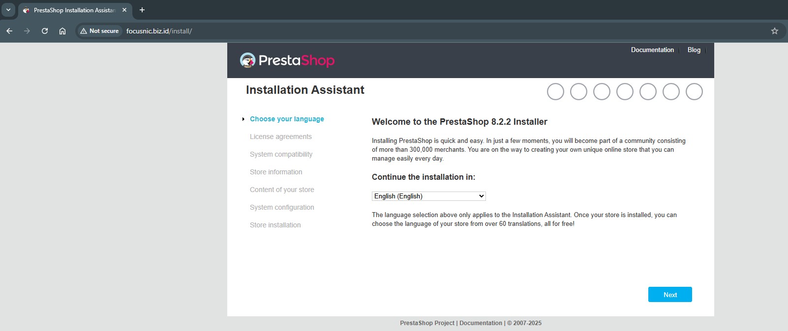 Access the PrestaShop installation via a browser, for example: http://focusnic.biz.id wait until the unzipping process is complete then select the language and click "Next"