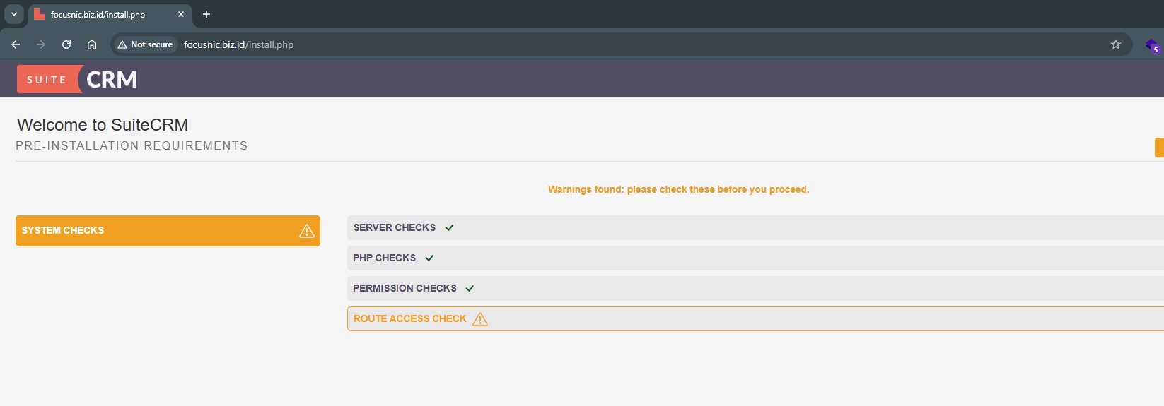 Set up SuiteCRM via http://$DOMAIN. SuiteCRM will perform server-side checks before installation. Ensure PHP, Server, and Permissions are checked.