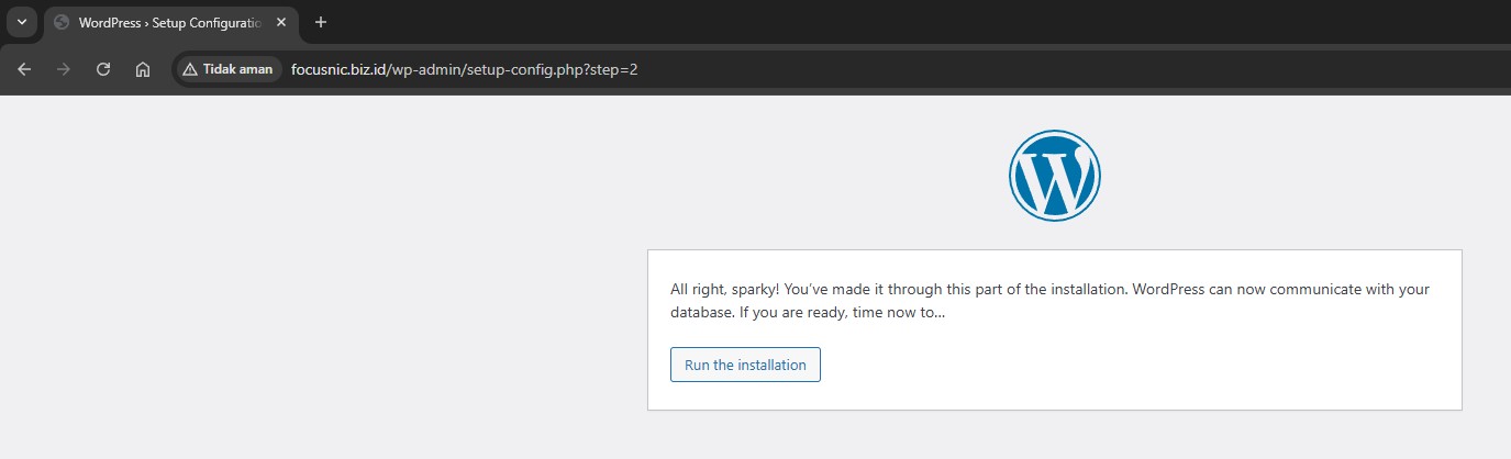 Access the WordPress installation via a browser, for example: http://focusnic.biz.id then click "Continue"