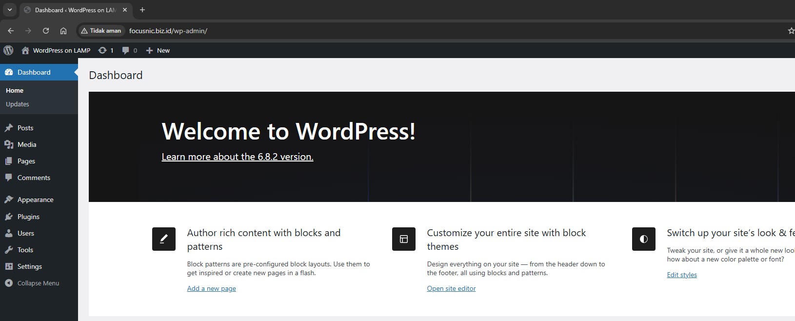Please login to the WordPress admin page via the following URL: http://$DOMAIN/wp-admin and here is the WordPress admin dashboard display