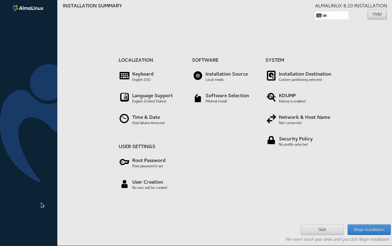 Berikut adalah tampilan instalasi mode GUI pada AlmaLinux. Meskipun tampilan GUI, saya akan menggunakan mode Minimal Install karena tidak memerlukan tampilan grafis GUI untuk server. Ketika melakukan instalasi AlmaLinux pertama kali yang saya lakukan adalah mengeset Timezone, Installation Destination, Network, dan Password Root