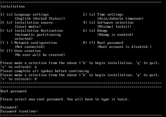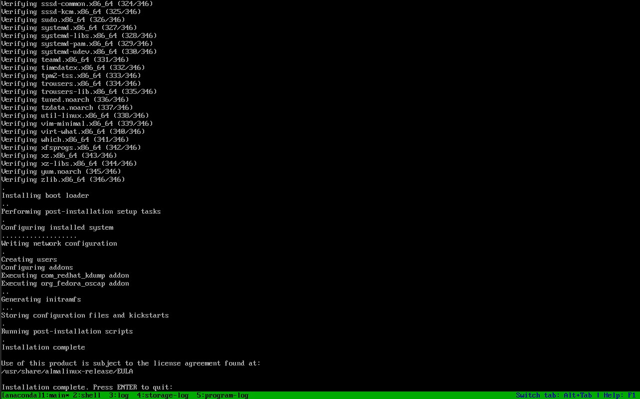 Jika sudah proses setup silahkan tekan huruf b pada keyboard untuk melanjutkan instalasi. Tunggu proses instalasi lalu tekan E untuk boot ke system almalinux