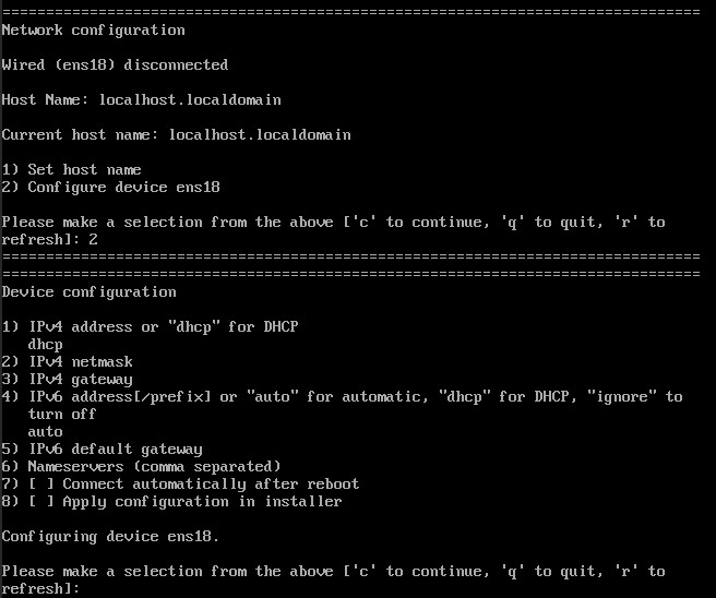 Langkah selanjutnya adalah konfigurasi network, tekan angka 7 pada keyboard untuk konfigurasi network. Anda bisa memilih konfigurasi STATIC atau DHCP, atau jika anda bingung bisa konfigurasi nanti pada saat sudah terinstall