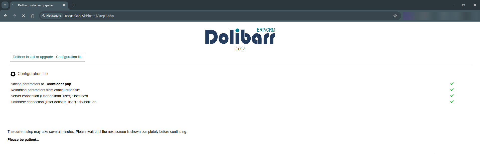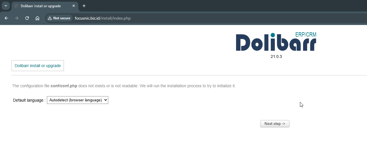 Silahkan akses instalasi Dolibarr pada browser dengan mengetik nama domain atau IP