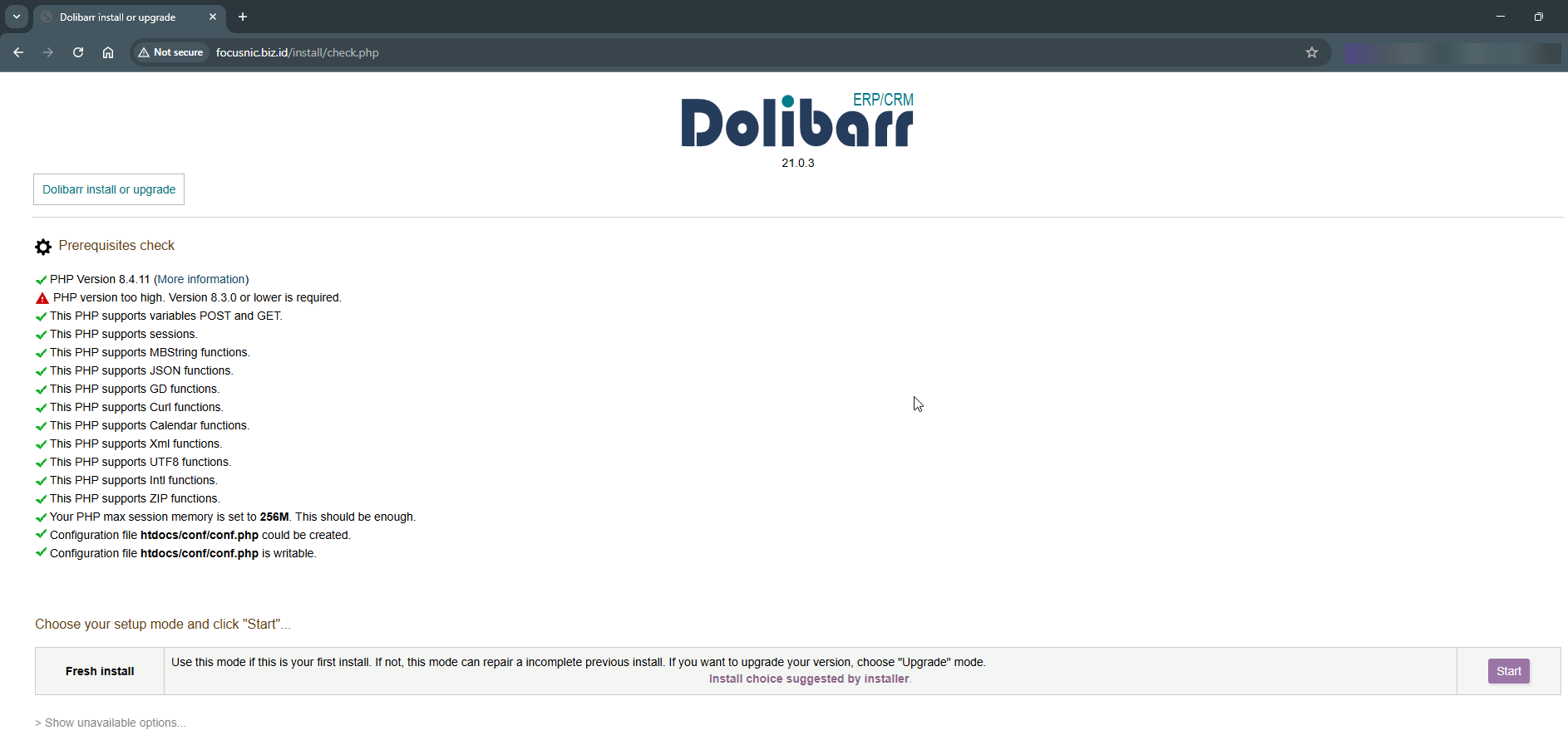 Dolibarr akan melakukan system checking sebelum melanjutkan instalasi, pastikan sudah terpenuhi