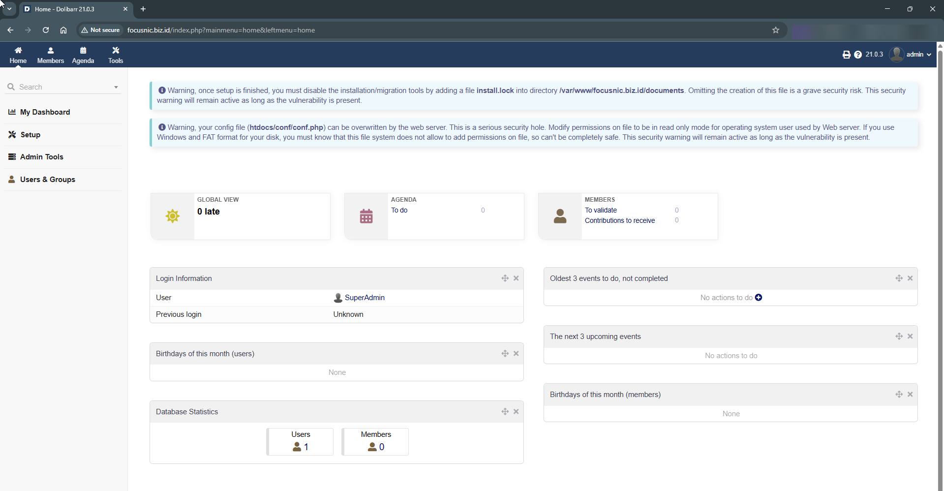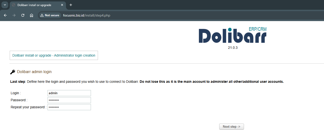 Akses halaman admin Dolibarr melalui http://$DOMAIN/admin/