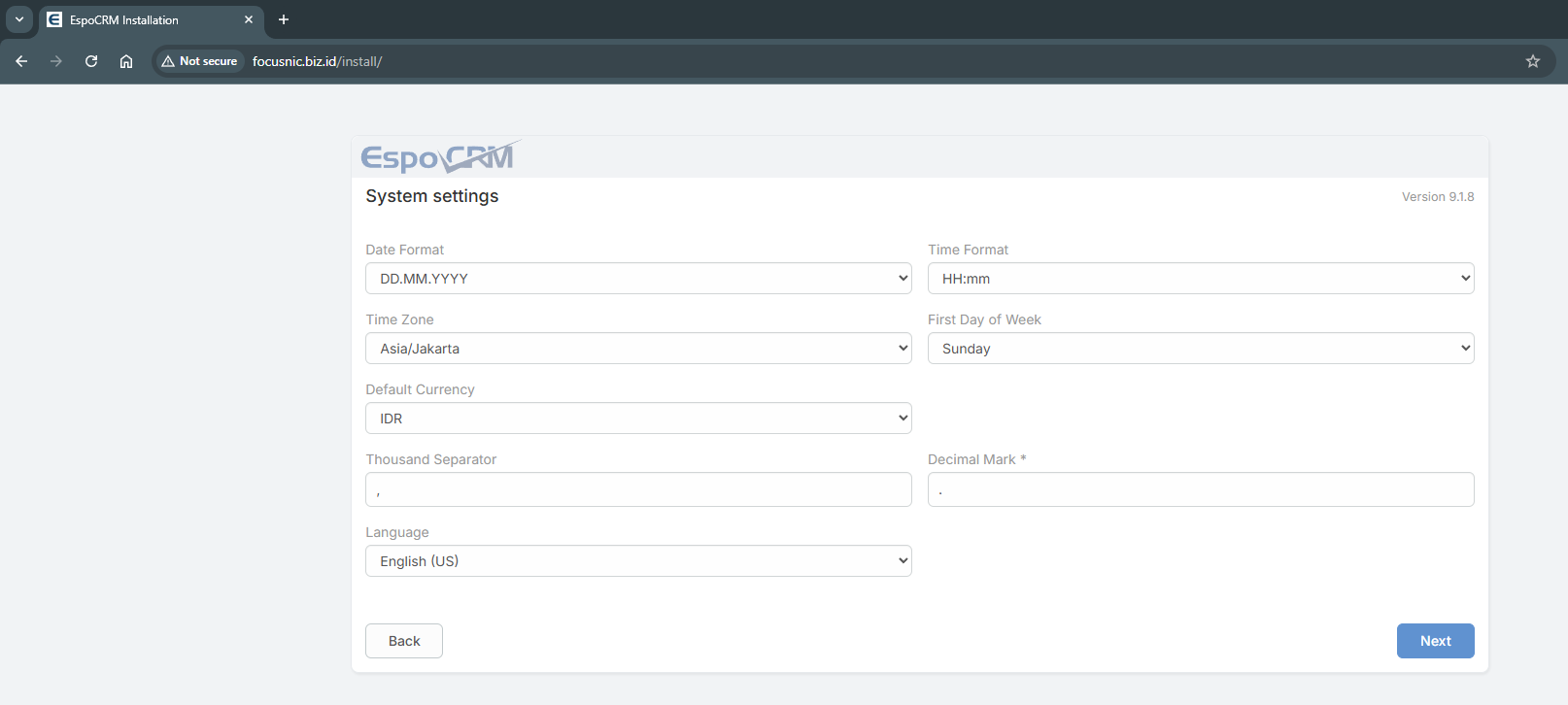 Setup EspoCRM melalui http://$DOMAIN. Anda bisa mengatur bahasa dan tema jika pada langkah awal ini