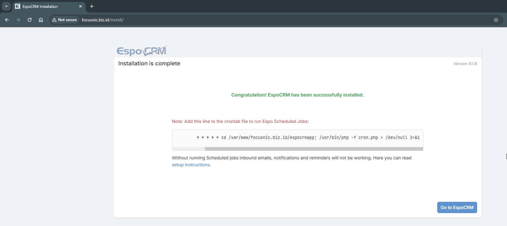 Instalasi EspoCRM sudah berhasil, serta terdapat informasi untuk menambahkan cron job pada server agar EspoCRM dapat menjalankan scheduled tasks dengan lancar