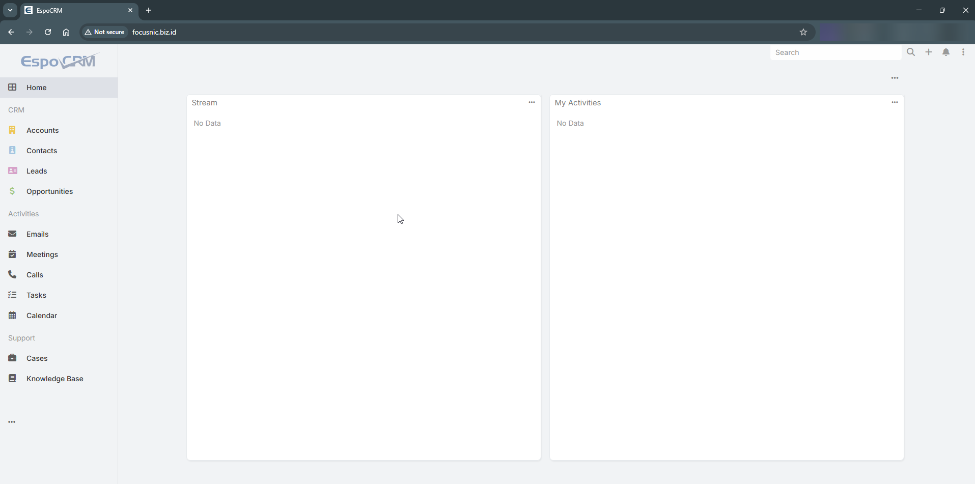Berikut adalah tampilan dashboard EspoCRM yang dapat diakses melalui http://$DOMAIN