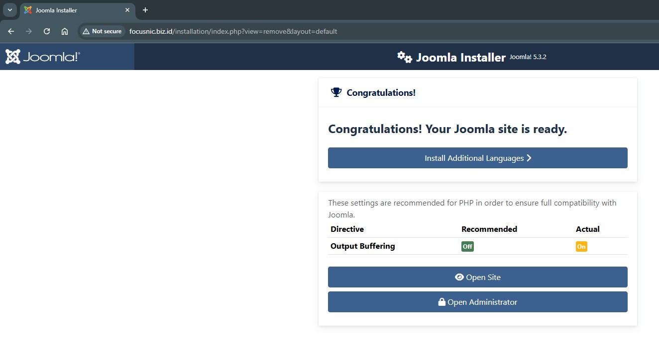 Instalasi Joomla dengan LAMP Stack di AlmaLinux 8 adalah proses yang relatif mudah jika dilakukan secara sistematis dan sesuai panduan. Dengan menyiapkan Apache, MariaDB, dan PHP secara benar, serta mengonfigurasi permission dan database dengan tepat, Joomla dapat berjalan stabil, cepat, dan aman. Menjalankan Joomla di atas AlmaLinux memberikan keuntungan stabilitas, keamanan tingkat enterprise, serta dukungan jangka panjang (LTS). Kombinasi ini menjadikan Joomla pilihan solid untuk situs bisnis, organisasi, dan kebutuhan profesional lainnya.