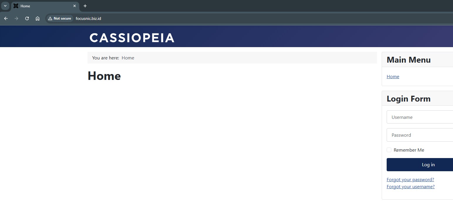 Akses instalasi Joomla melalui browser, misalnya: http://focusnic.biz.id lalu sesuikan bahasa yang ingin digunakan dan isi nama situs lalu klik "Setup Login Data"