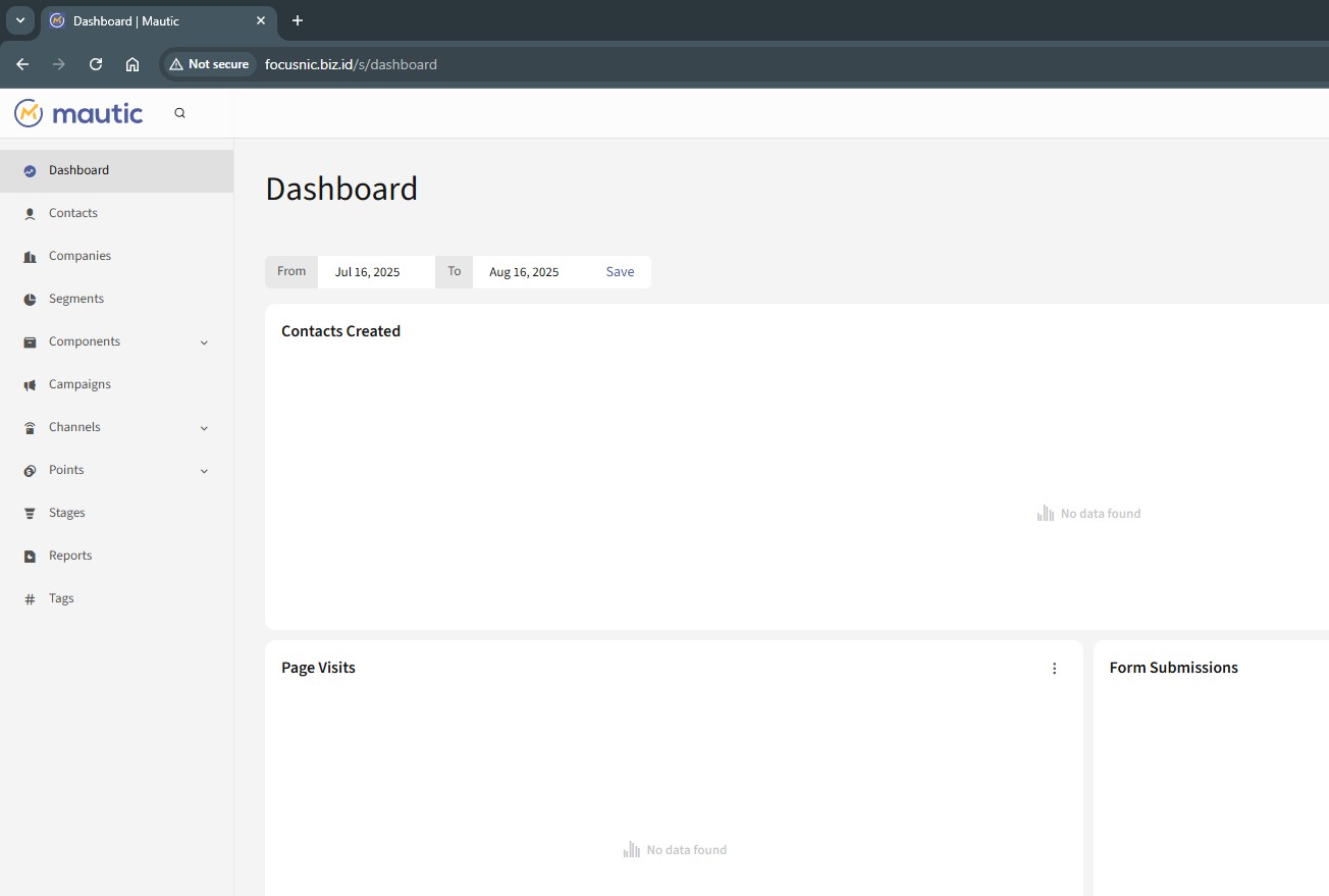 Berikut tampilan dashboard admin Mautic dapat diakses melalui http://$DOMAIN/s/login