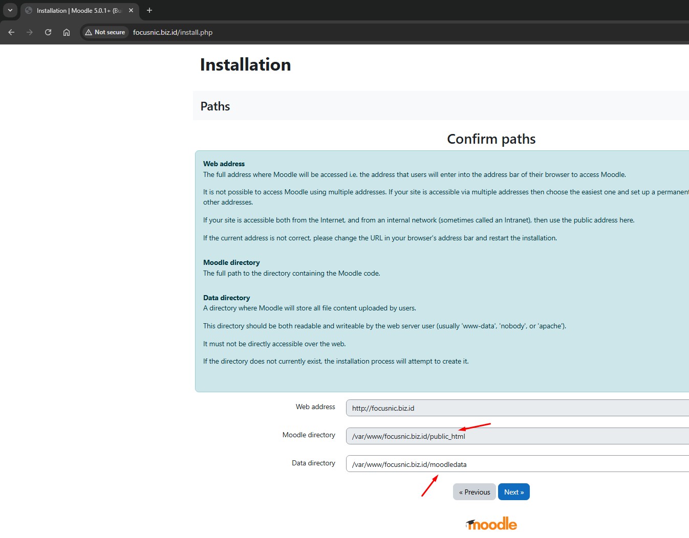 Kemudian konfirmasi path untuk direktori Moodle dan Moodle Data. Biasanya Moodle Data direkomendasikan ada diluar public_html karena berisi data sensitif yang tidak seharusnya diakses secara publik. Jika sudah mengkonfirmasi path direktori Moodle silahkan klik "Next"