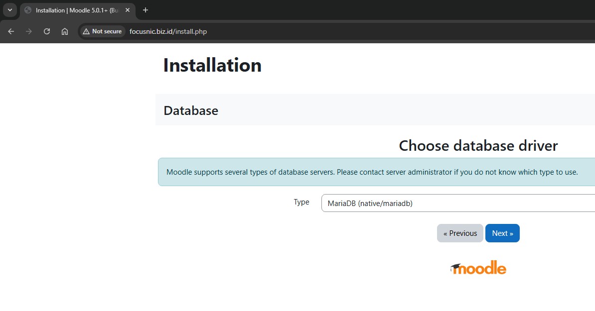 Akses instalasi Moodle melalui browser, misalnya: http://focusnic.biz.id pilih bahasa lalu klik "Next"