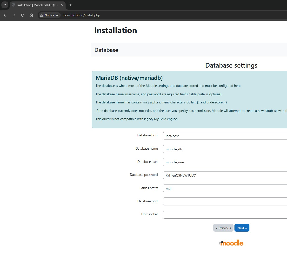 Lalu isi informasi database yang sudah dibuat seperti nama db, username, dan password. Untuk database port dan socket silahkan kosongkan karena kita akan menggunakan local DB dengan server yang sama dengan instalasi Moodle. Jika sudah, lalu klik "Next"
