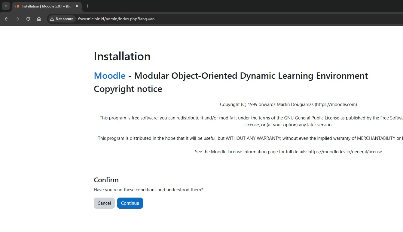 Konfirmasi instalasi Moodle dan lisensi agreement, lanjutkan dengan klik "Continue"