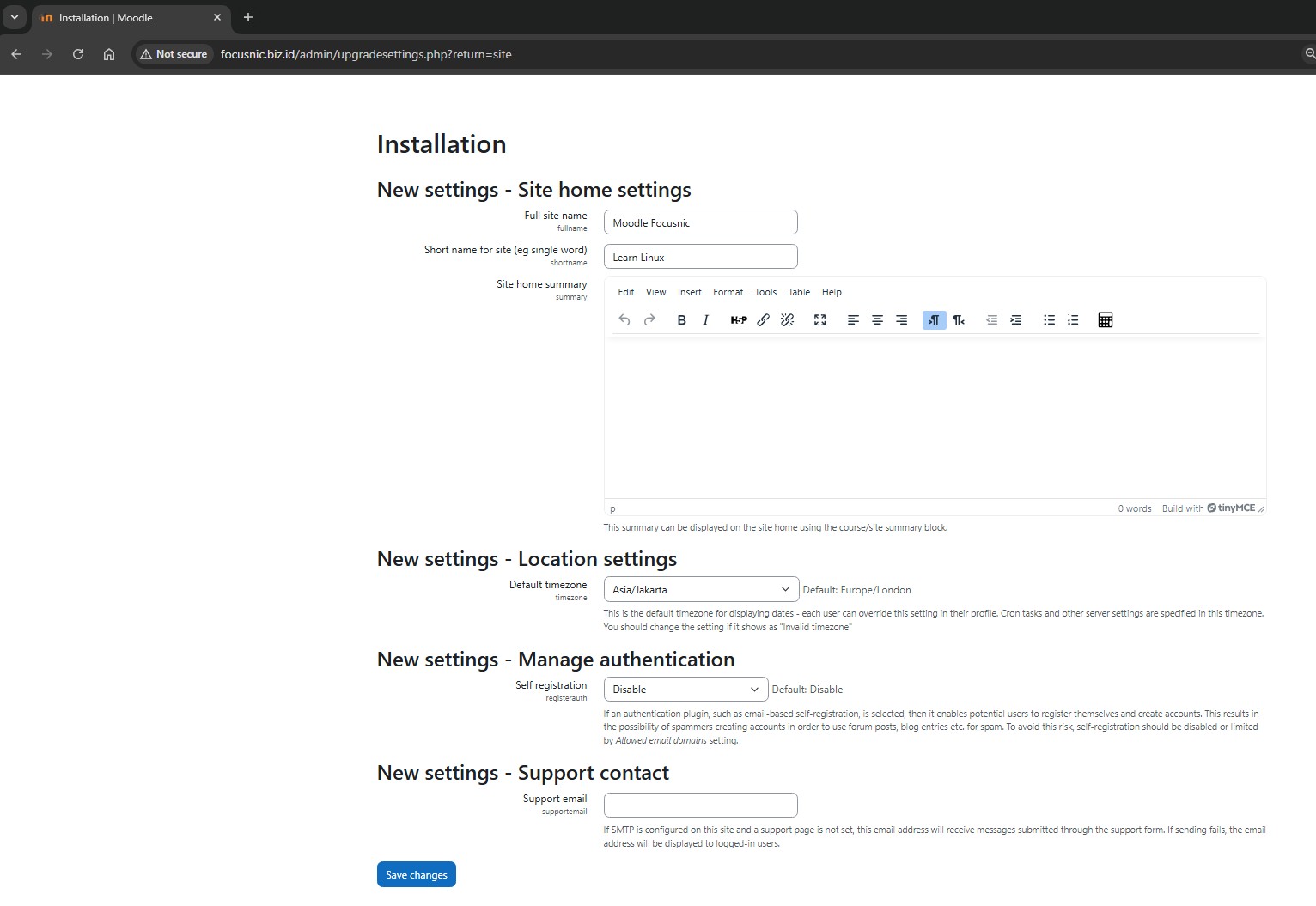 Isi nama home front page Moodle, lalu klik "Save changes"