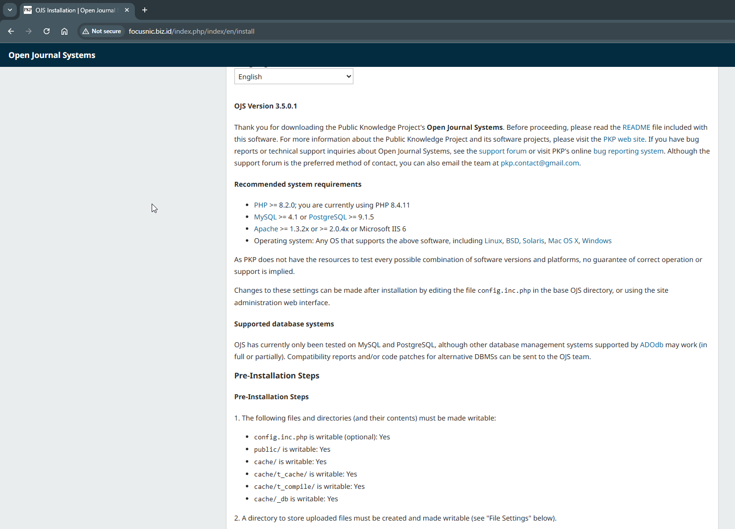 Lanjutkan instalasi OJS melalui browser dengan mengetik nama domain atau IP. Kemudian, OJS akan melakukan pengecekan sistem, pastikan direktori sudah writeable