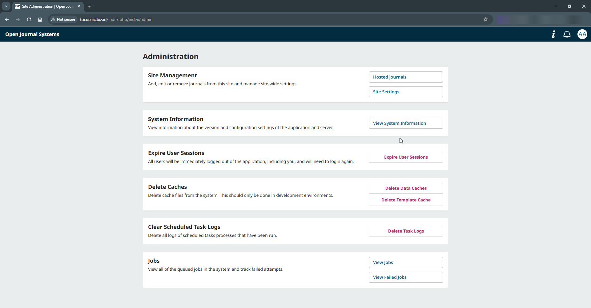 Berikut adalah tampilan dashboard OJS yang dapat diakses melalui http://$DOMAIN/index.php/index/login