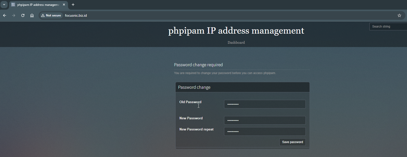 Akses phpIPAM melalui browser dengan mengetik nama domain atau IP. Masukkan user default admin dan password ipamadmin. Kemudian setelah login silahkan set password baru