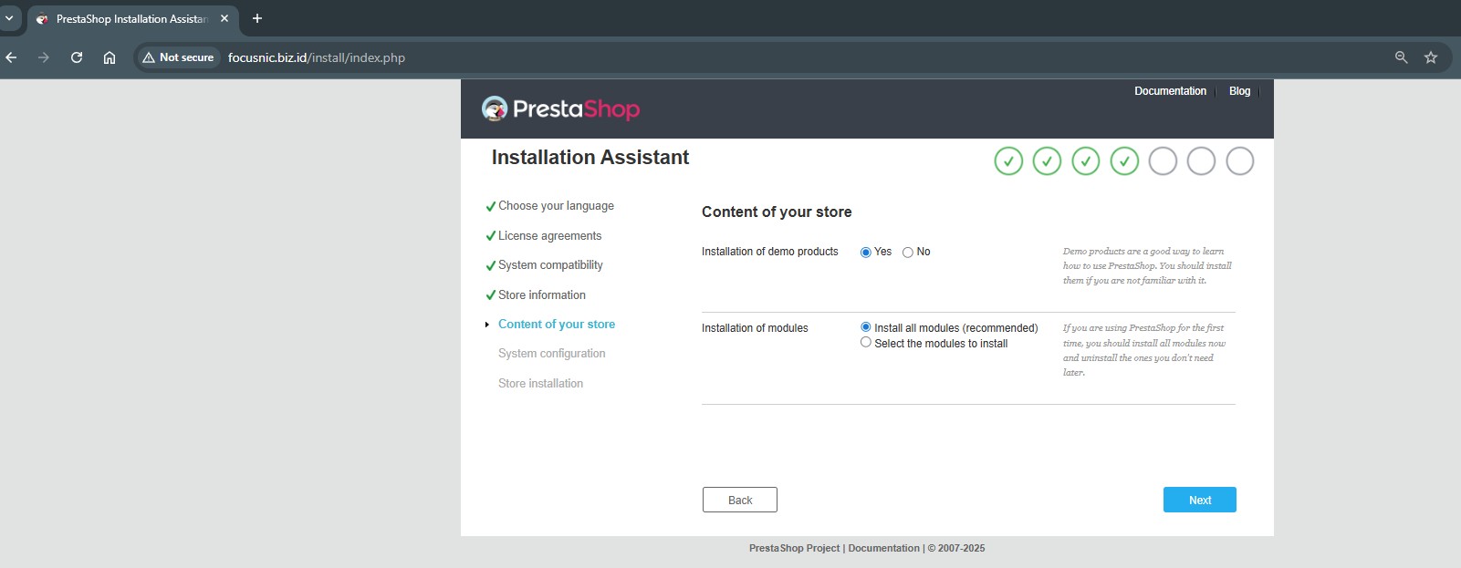 Akses instalasi PrestaShop melalui browser, misalnya: http://focusnic.biz.id tunggu hingga proses unzipping selesai lalu pilih bahasa dan klik "Next"