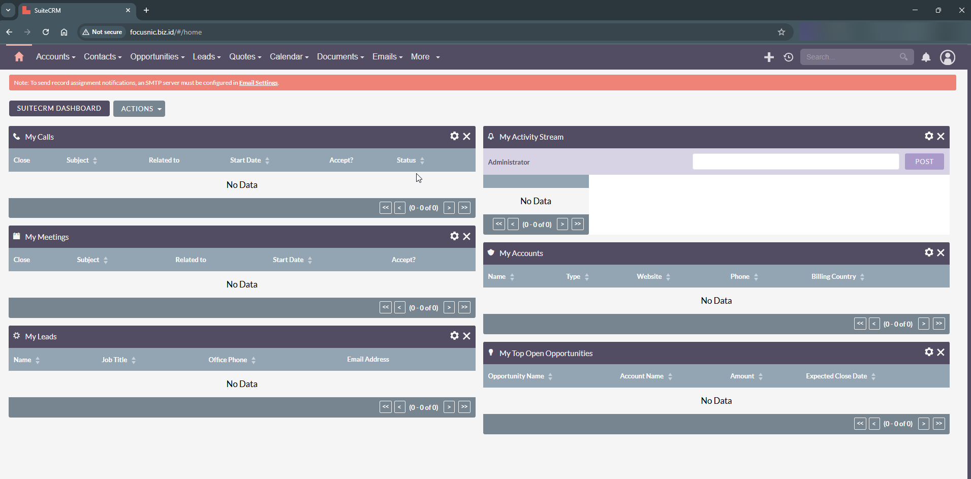 Berikut adalah tampilan dashboard SuiteCRM. Silahkan akses melalui http://$DOMAIN/#/Login