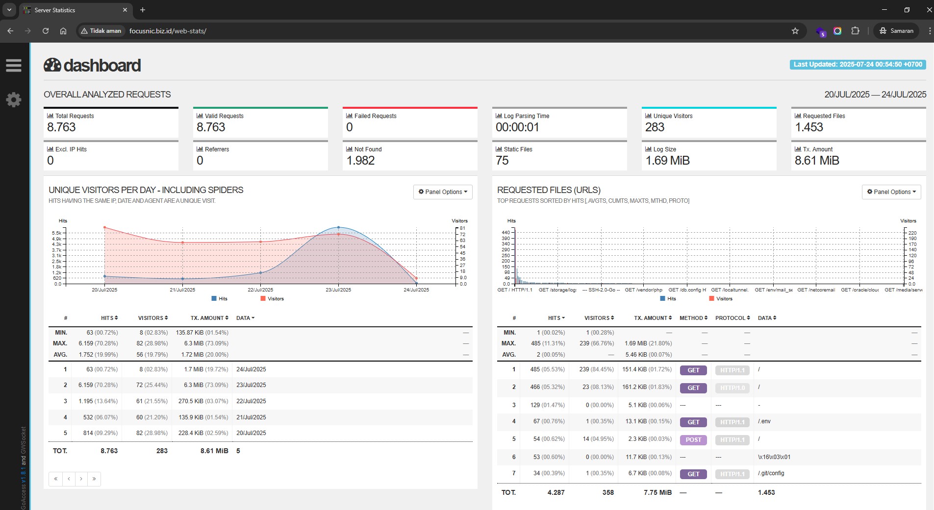 Dengan menggunakan GoAccess di Apache Web Server pada AlmaLinux 8, kita dapat menyajikan statistik pengunjung secara real-time, efisien, dan menarik secara visual. Integrasi yang mudah dengan Apache menjadikannya pilihan ideal untuk administrator yang membutuhkan monitoring log ringan namun powerful. Baik dalam skala kecil maupun besar, GoAccess mampu membantu kita menganalisa pola trafik, mendeteksi anomali, serta menyusun strategi optimasi web server yang lebih baik.