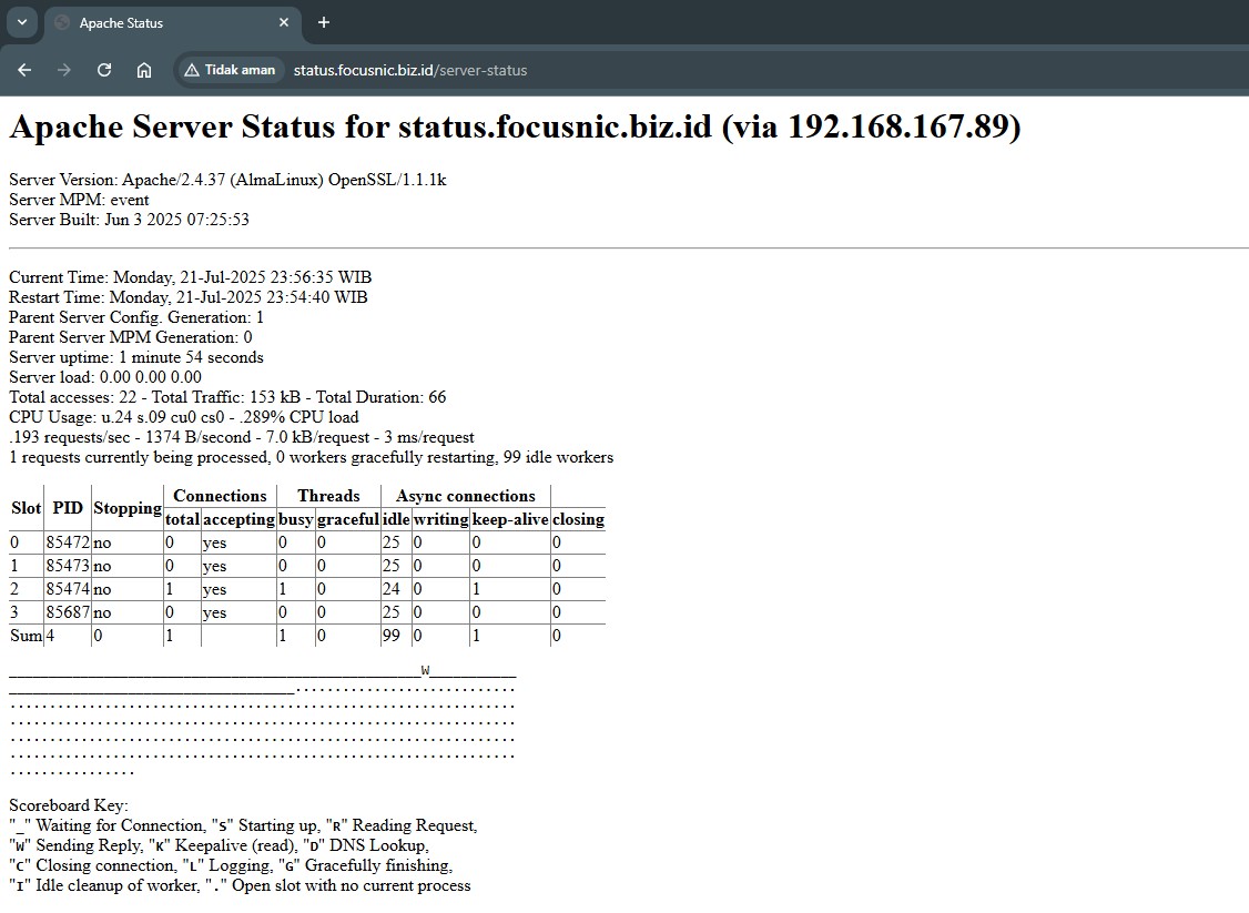 Dengan mengaktifkan Apache Load Status, administrator dapat melakukan troubleshooting, pengambilan keputusan skalabilitas, dan pemantauan beban sistem secara lebih tepat.